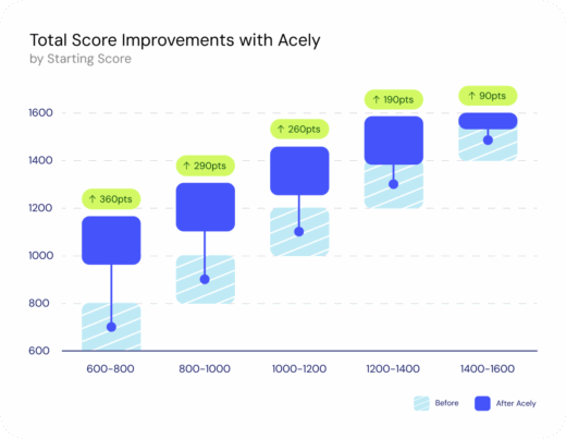 Your path to a high SAT score starts here. Students who use Acely for at least one month see significant SAT score increases. Our personalized prep platform targets your weak spots, creates a custom SAT study plan, tracks your progress, and builds your confidence for test day.