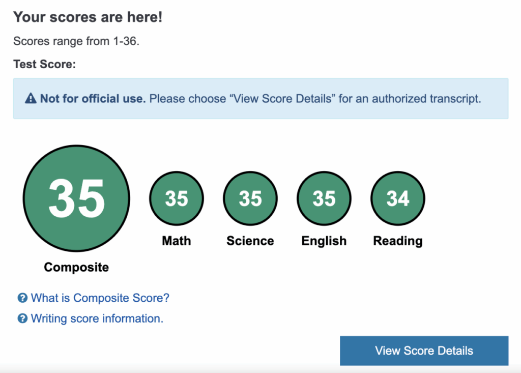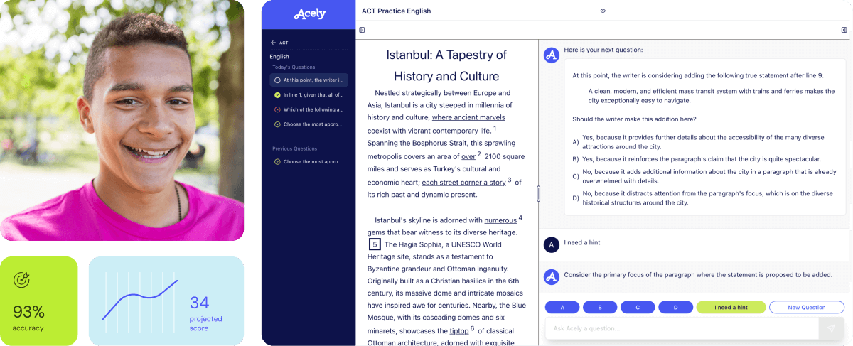 “I love how Acely creates practice tests that feel just like the real ACT. They made me feel super comfortable when I took the test for the first time in December. Just a few months earlier, I had almost no experience with the ACT at all. Acely helped me understand the types of questions that appear on the test. The program told me where I was making mistakes and where I could improve my time management. On test day, there wasn’t a single question format I hadn’t seen before, thanks to Acely’s comprehensive curriculum. Acely has been a big help!”