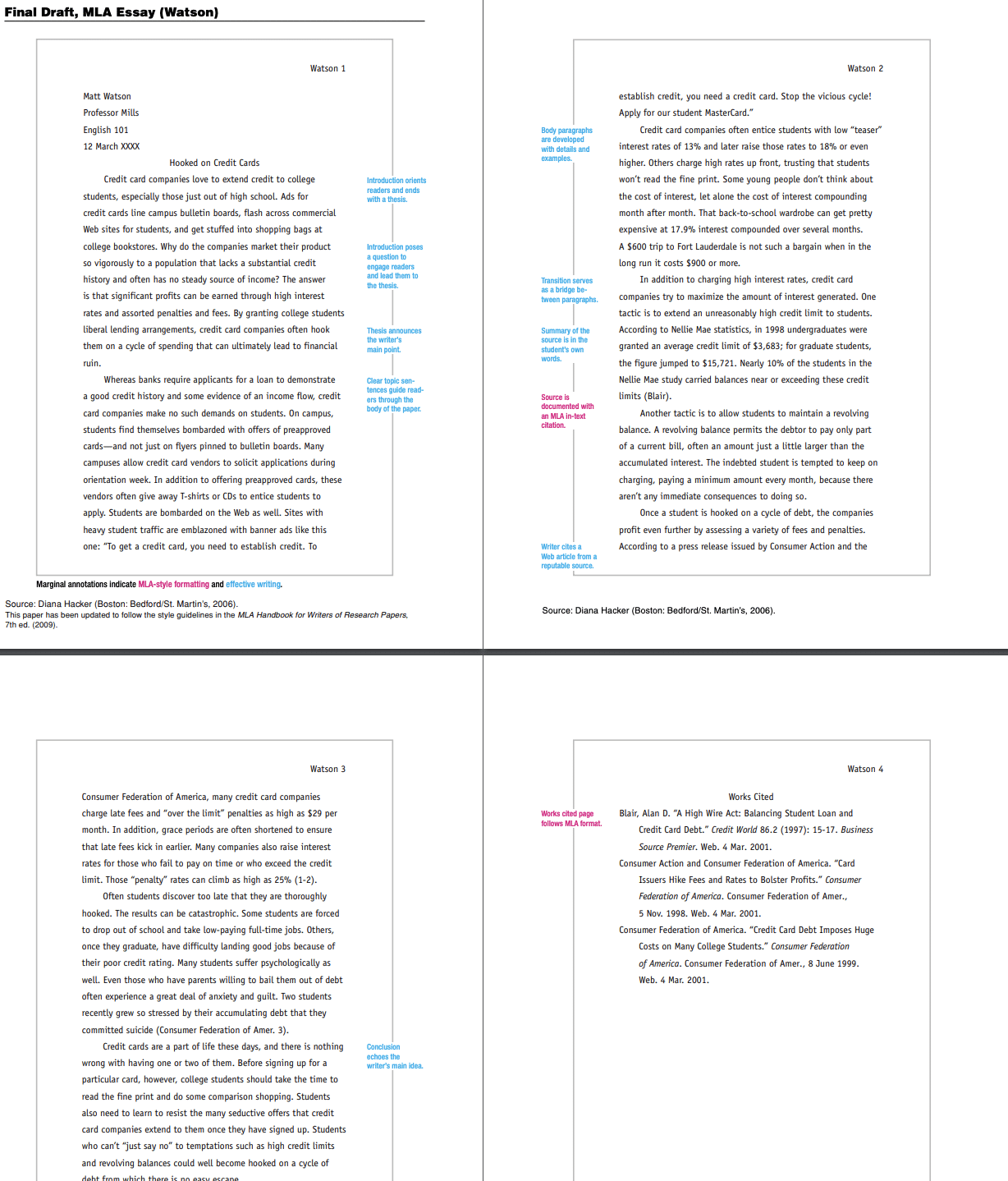 The helpful side notes provide a great guide that can help us as we explore this example. You can see the topic “Hooked on Credit Cards” and the introductory paragraph right after that. From there, we can tell that the writer believes that credit card companies are trapping students into spending too much, which leads to bigger problems later.