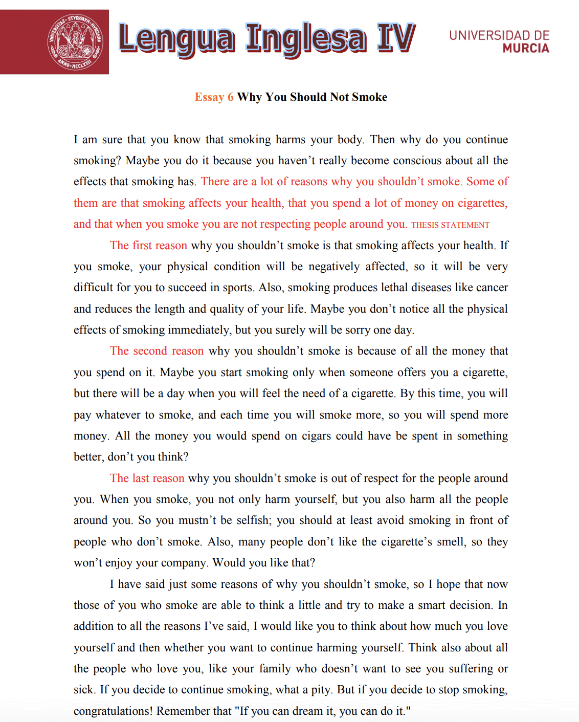 While this is a much less advanced structure than the first, it follows pretty much the same organizational plan. You find the introduction first, which draws the reader into the thesis statement. Then, we have three body paragraphs in which the writer states three reasons why you, the reader, should not smoke.