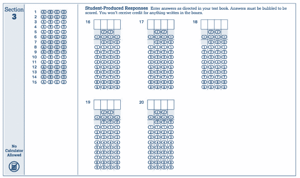 There are a total of 45 multiple-choice questions and 13 grid-in questions. The grid-in questions require students to enter their answers on the answer sheet. Here’s a sample of how the math section’s answer sheet would look.