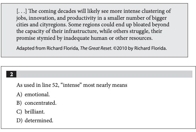 The word “intense” has several meanings, including “forceful,” “severe,” “concentrated,” “passionate,” etc. It’s not always possible to know all the synonyms of a word, but you can always use context clues to arrive at the correct answer, especially when looking at an unfamiliar word (more on that later).