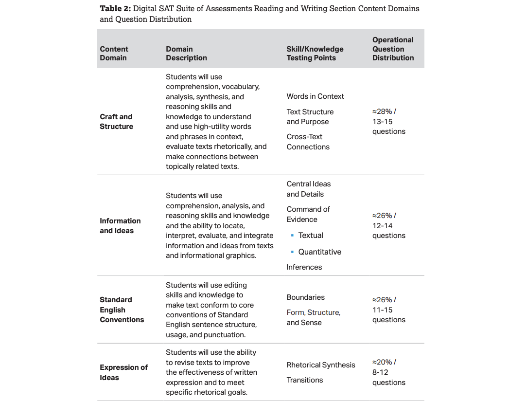 This section is one of the subcomponents used to determine your raw score in the new SAT. College Board doesn’t specify how many of these questions you’ll get. The only thing we know for sure is that the Craft and Structure content domain contains 13-15 questions. It is this content domain that includes Words in Context, Text Structure and Purpose, and Cross-Text Connections testing points.
