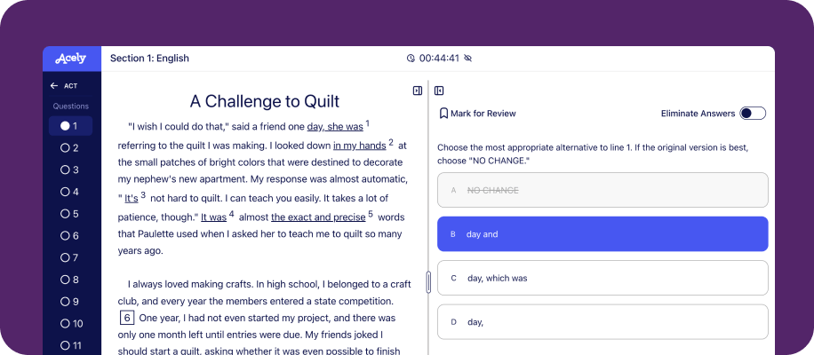 Our content is handcrafted by the Acely curriculum team, who are assisted by Acely’s AI workflows. The curriculum team consists of educators and test prep experts with experience in developing questions for multiple standardized tests.