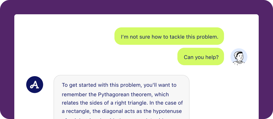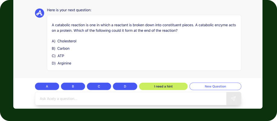We built a system that interfaces with foundational LLMs to facilitate conversations between the user and the Acely bot. We can plug in various generative AI models to this system and rapidly experiment in order to evaluate which foundation model can deliver the most helpful, conversational, and natural-sounding study buddy for users. Hints are generated by AI and answer explanations are augmented by AI.