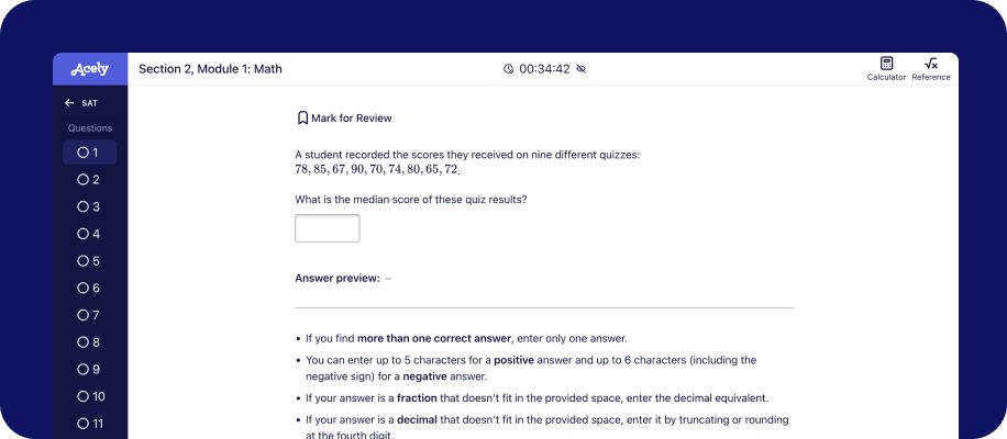 Yes! Acely offers 7,500+ SAT practice questions plus 25 full-length adaptive SAT practice tests. The test content and features are based on the CollegeBoard’s Bluebook digital SAT test. Students can continue taking the adaptive test until they run out of new questions.