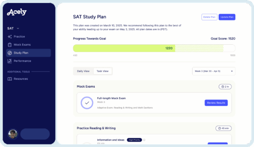 Enter your current score and goal score and Acely will create a plan that adapts to you. Get guidance on how much to practice each section of the exam and see areas where you could make up the most points.