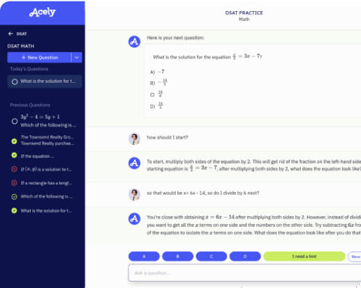 Get SAT, PSAT, and ACT prep with Acely. Practice with thousands of real test questions from the comfort of your own home. Get access to cutting edge tools and AI hints & explanations.