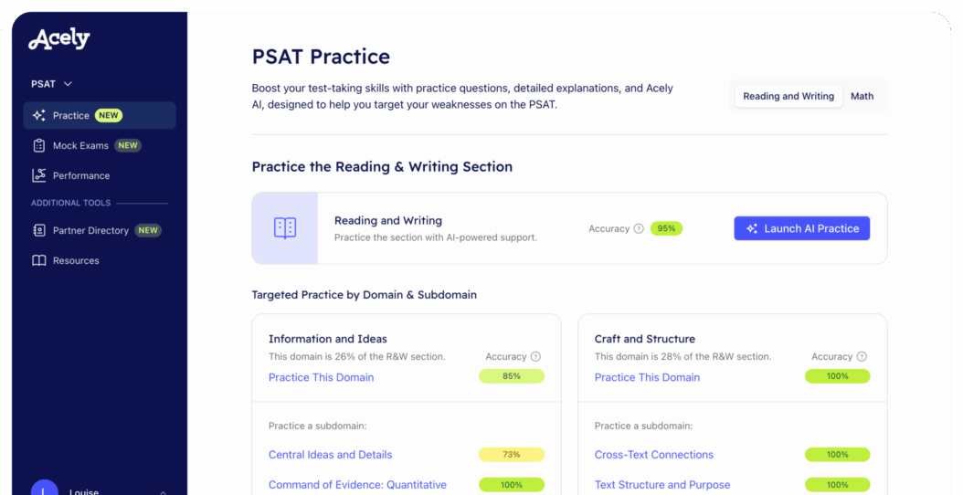 Ditch the old prep books that offer zero feedback. Acely’s dashboard is built for the new digital PSAT. It instantly analyzes your performance, providing the specific, actionable insights you need to see real progress and stay engaged.