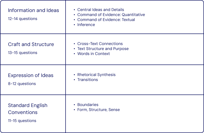 The exam is 2 hours and 14 minutes long and split into two sections: Reading & Writing and Math. Each section has two modules, making 4 total modules.